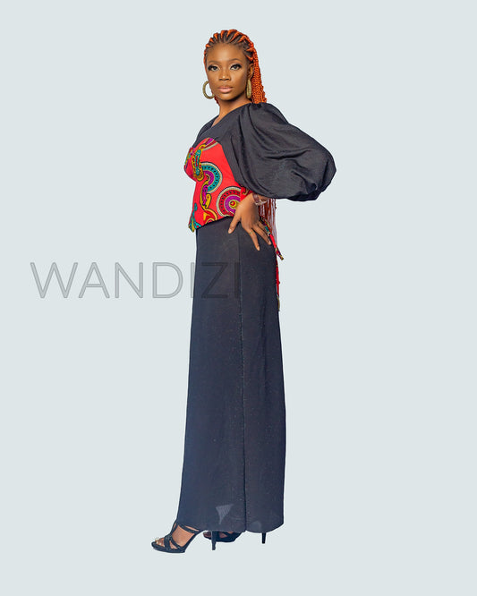 Black Puff Sleeve Dress with Ankara Bustier, African Print Maxi Dress, Ankara Long Dress