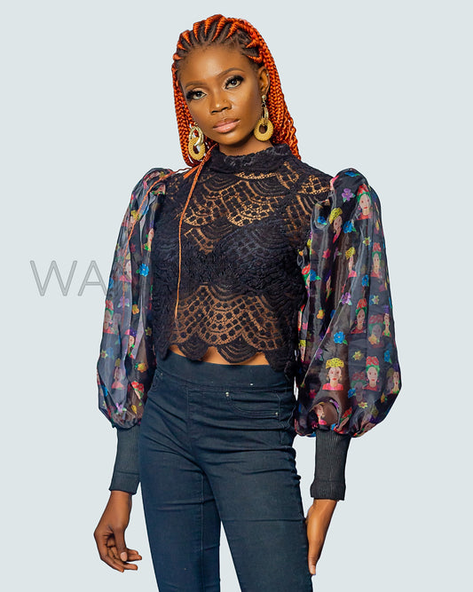 Lace Organza Puff Sleeve Top, Lace Mixed With Organza Crop Top