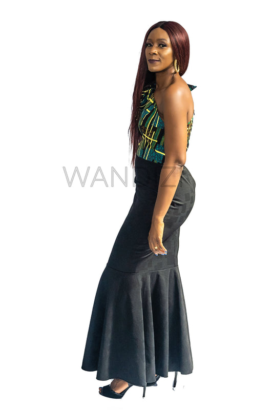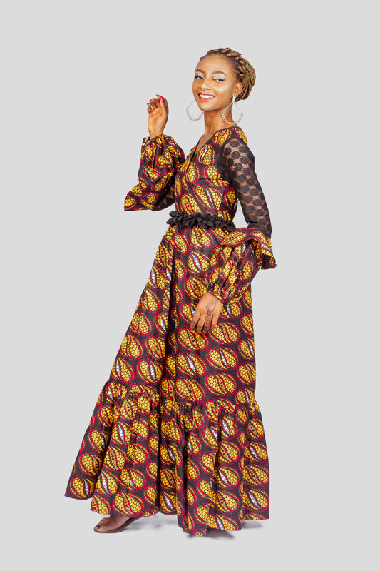 Ankara and Lace Mix Maxi Dress with velvet trimmings