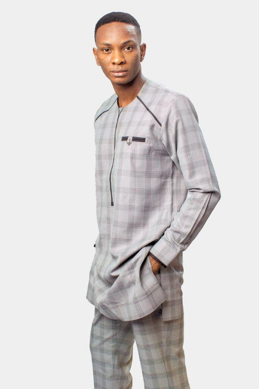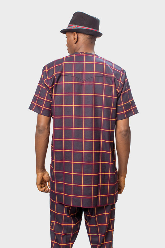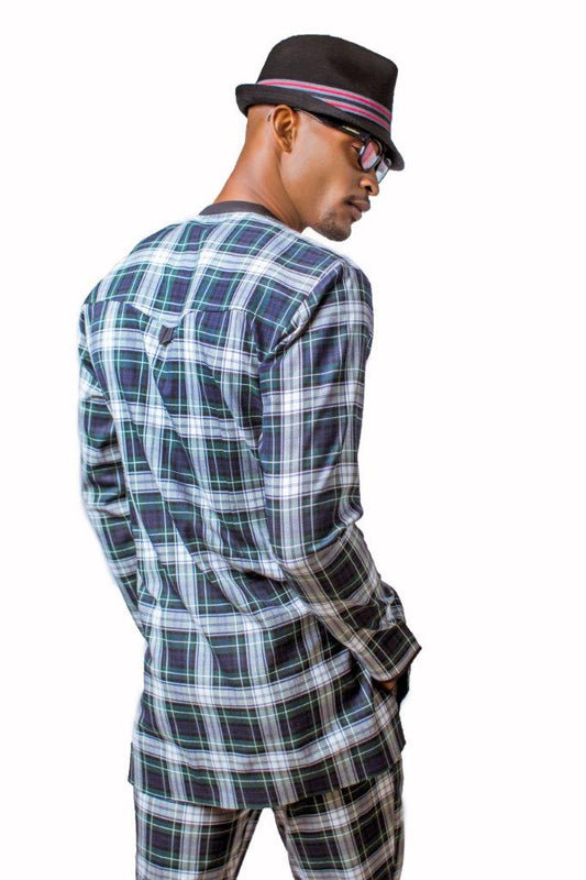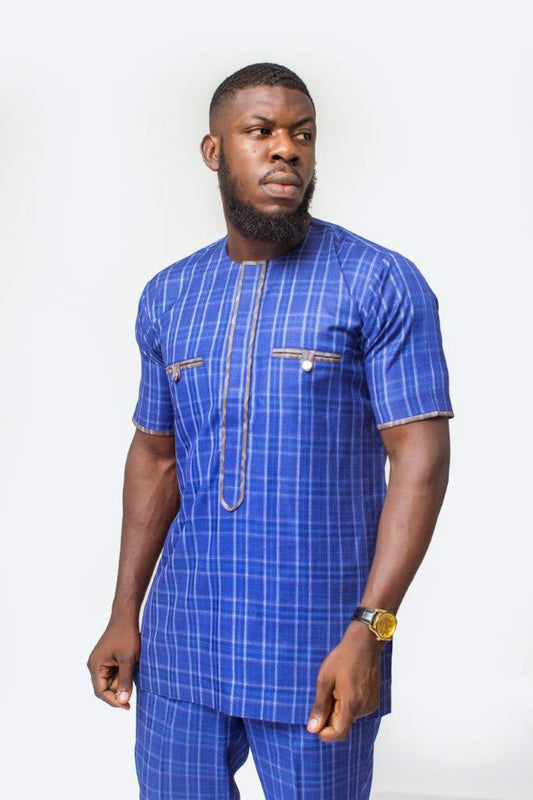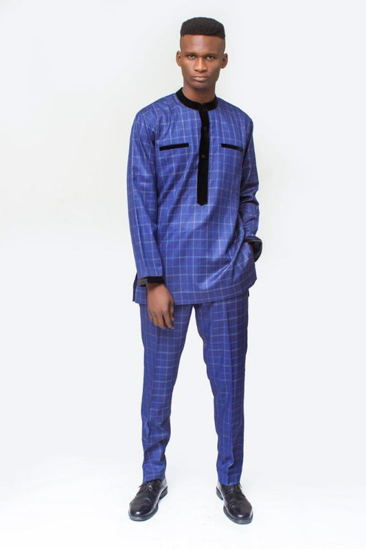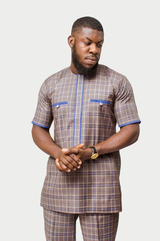 Brown Tartan African Men's Suit with contrasting Tartan Blue Trimmings
