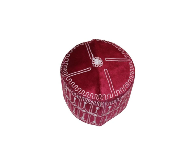 Ado Kufi Hat in Garnet Blossom is a handcrafted cap featuring traditional designs that symbolize important events. It is foldable, expandable, and fits most heads comfortably. Made from a blend of fabrics, it suits both casual wear and special occasions.