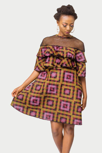 Beautiful colourful layered flare African print ankara and net mix dress